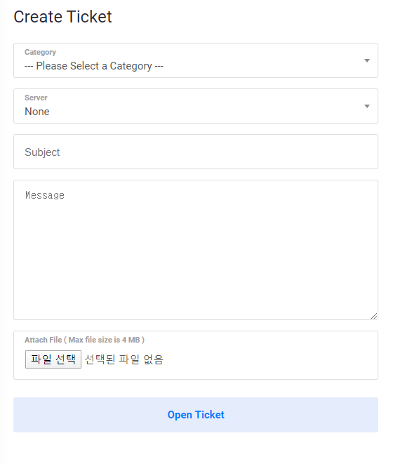 버튼을 누르시면 티켓 내용을 입력하는 페이지로 이동하실 겁니다. 아래 사진과 같은 부분이 나오셨다면 잘 따라오신 겁니다.